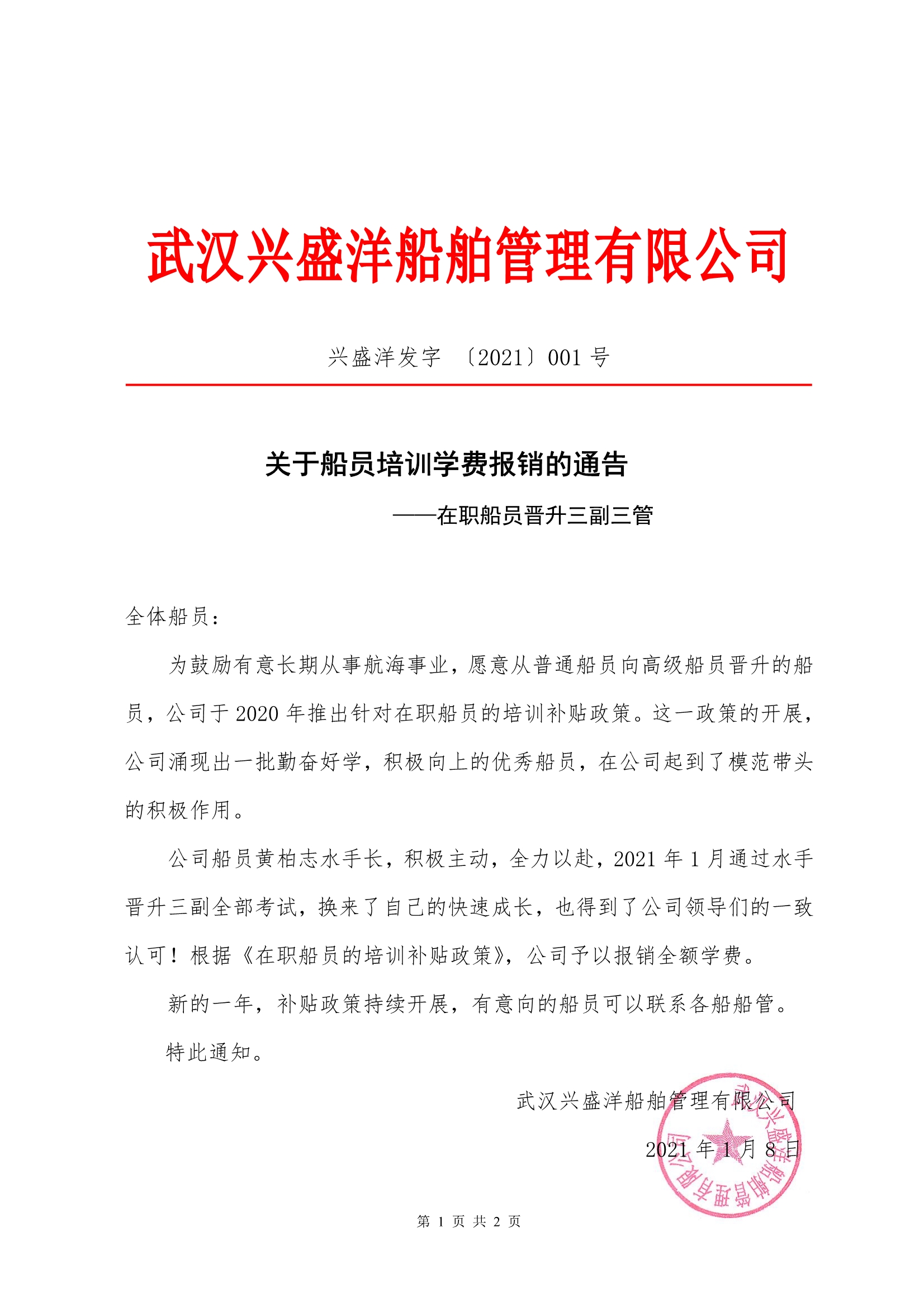 興盛洋發(fā)字 〔2021〕001號 關(guān)于首例在職船員培訓(xùn)學(xué)費報銷通告